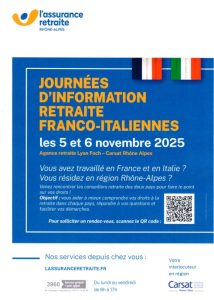Nous vous informons que la Carsat Retraite et Santé au travail organise des journées d’information sur les retraites franco-italiennes, les 5 et 6 novembre prochains, de 9h00 à 16h30, à l’agence Lyon Foch – Carsat Rhône-Alpes.